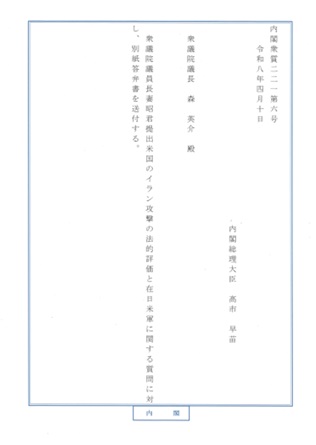 2026年04月10日 質問主意書に対する政府の答弁書が届きました(2本) ■米国のイラン攻撃の法的評価と在日米軍に関する質問主意書 質問主意書 政府の答弁書(回答) ■いわゆる「消えた年金」を探す「持ち主不明記録検索」に関する質問主意書 質問主意書 政府の答弁書(回答) 前のページ 一覧に戻る 次のページ アーカイブ 202671 2025141 2024156 2023127 2022126 2021155 202074 201964 201872 2017133 2016175 2015278 2014276 2013217 2012182 2011175 2010269 2009139 2008145 2007145 200646 カテゴリー お知らせ84 国会質疑169 メディア280 写真日記1,312 日々の活動(旧)1,008 前のページ 一覧に戻る 次のページ